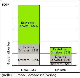 Warum ein Content Managment System? Die Darstellung Ihrer Produkte und Services ist für Sie Wettbewerbs - Entscheidend. Die Pflege und die Gewährleistung von Aktualität und Konsistenz der Daten sind jedoch aufwendig und kostspielig. Die Nutzung eines Content Management Systems (CMS) senkt Kosten für Pflege von Inhalten und Systemen. Unsere Erfahrungen mit Content Management Systemen zeigen, daß durch den Einsatz des richtigen Content Management Systems bis zu 70 % der Kosten für Pflege und Erstellung von Inhalten für Website`s eingespart werden können. Das heisst für Sie: Die Vermeidung des Einsatzes von Hochqualifiziertem IT-Personal für die Pflege und Erstellung von Inhalten führt bereits bei wenigen Mitarbeitern zu einem Return on Investment.